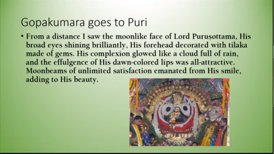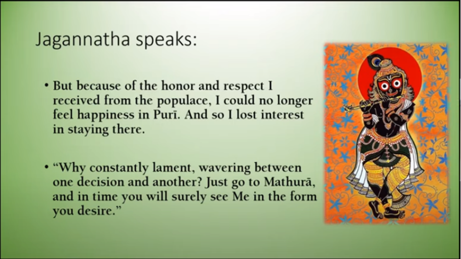 And then Jagannatha spoke to him [Laughs]. So then Jagannatha said, don’t lament. So Gopakumar was thinking, should I leave this place? But if I leave then I’m leaving Jagannatha. I don’t want to leave Jagannatha. So what should I do? So then Jagannatha said, you should leave. Go to Mathura. So, if you go there then, you will see me in the form that you really desire.