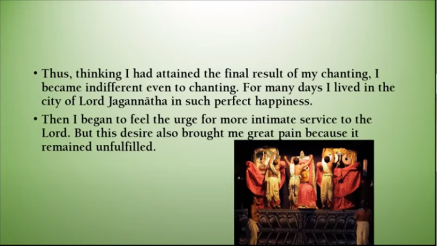 Anyway, he was very satisfied there in Puri and he thought, now I’ve got the final result of my chanting because I see the Supreme Lord. So, he even became less interested in chanting because he felt so happy there. But then he felt, I have to serve this deity, but he wasn’t allowed to serve the deity, so he felt dissatisfied.