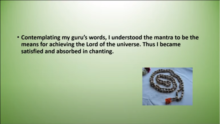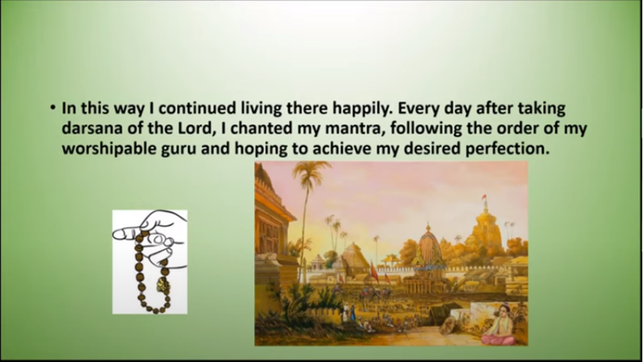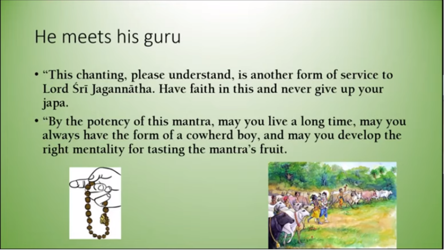 And one day then he saw his Guru. So the Guru said, actually this mantra is service to Jagannatha. Chanting this mantra is service to Jagannatha. Don’t leave the chanting. So he said, by the power of this mantra you will live a long time and you will get the form of a cowherd boy. And you’ve developed the right mentality for tasting the final results of this mantra. Mentality, proper mentality to get the result of the mantra.