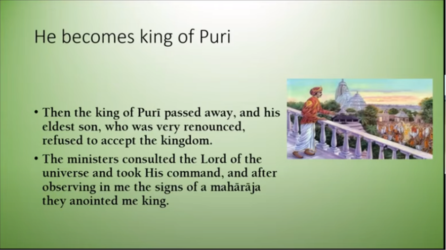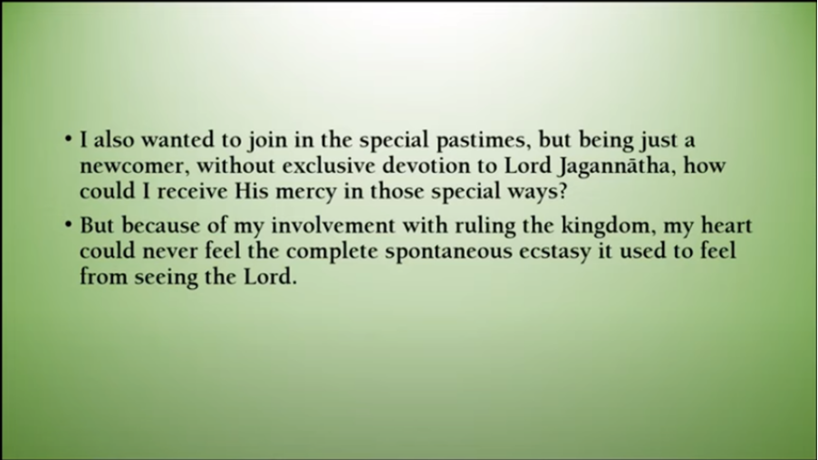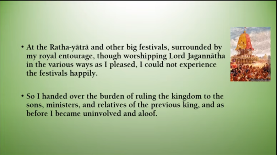 So, again he felt dissatisfied because he wanted to serve Jagannatha in a special way but he wasn’t allowed to [Laughs]. He also became distracted because he had to rule the kingdom.