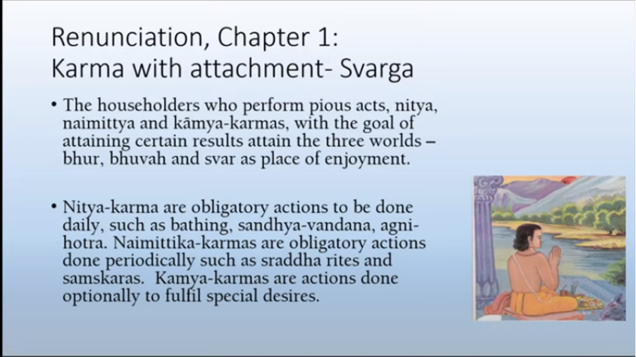 - Kamya Karma : And then we have kamya karmas, which means we do certain activities to fulfill specific desires. For instance, if you want to have children, then you do some specific sacrifices and vratas, etc, for that. So, the normal householder follows dharma with desire to get some elevation and go to Svargaloka.