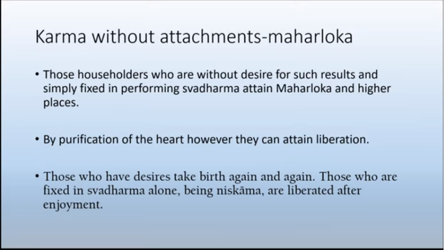 If the householder becomes very detached and does not want those results, but he simply does activities as part of duty as svadharma, then he goes beyond Svargaloka. He can go to Maharloka and Janaloka. And if they purify themselves further, then they can get liberation. So, those with desires take birth again and again. Those that start niskama and stop the desires, then eventually they get liberated.