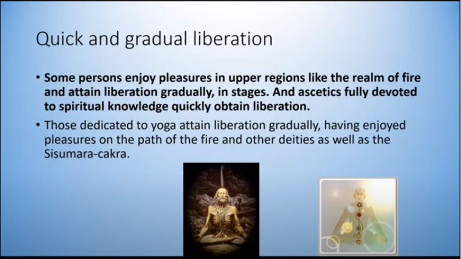 So, you can actually get liberation in two ways. You can go a gradual process or a quick process. So, the gradual process is used by many yogis, and they go through upper planetary systems gradually, they get a little enjoyment in these places, etc, and finally they get liberation. Other persons who are completely renounced, and completely dedicated to spiritual life, can get quicker liberation.