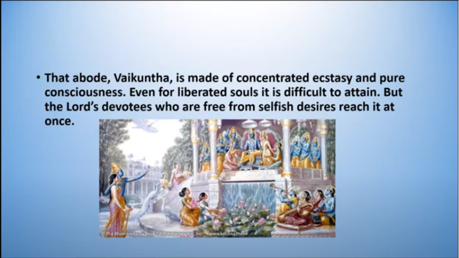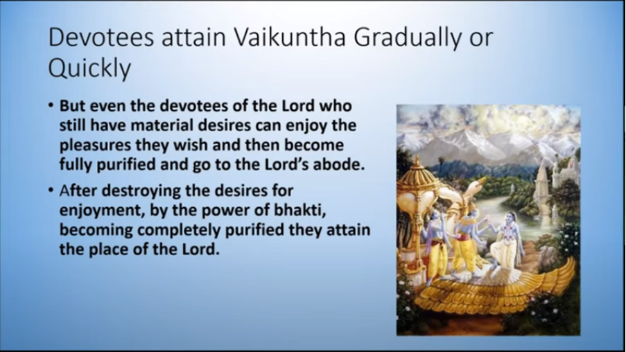 Similarly, devotees may have desires also, material desires, so they can also gradually elevate [Laughs] in different planetary systems, and then go to the Lord’s abode in Vaikuntha. If they practice pure bhakti, then they can go very, very quickly.