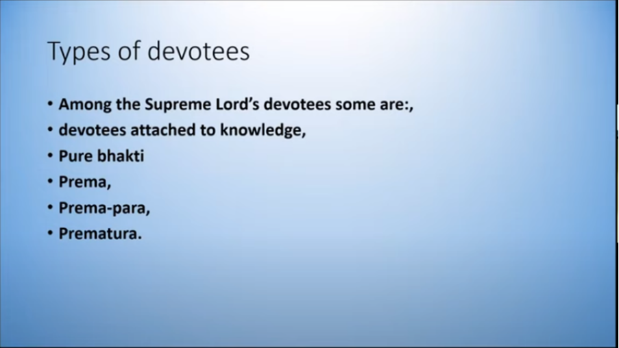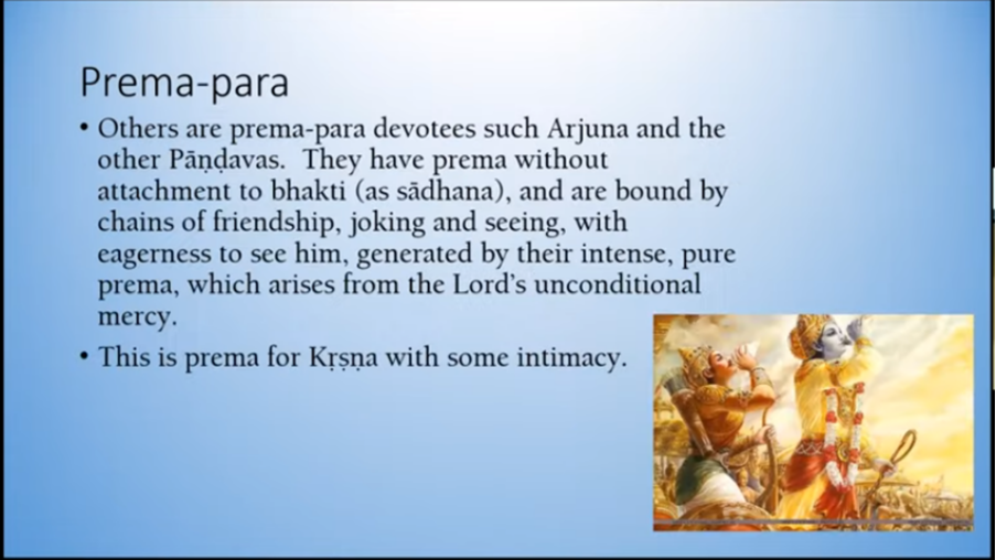 Then we get devotees called prema-para devotees, who have a more intimate relationship to the Lord, like Arjuna with Krishna, or the Pandavas with Krishna. So, this is prema with some intimacy and basically it’s with Krishna.
