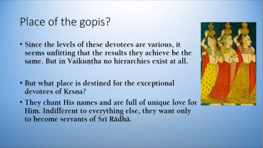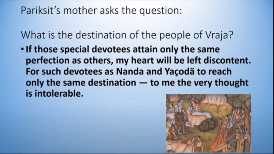 Do the people of Vrindavan, do they get the same result as everybody else or do they get something special? Do Nanda and Yasoda get the same destination as everybody else? So then, of course, Uttara says they shouldn’t, they should get something much superior but then she’s asking this to Parikshit, what is the destination of [Laughs] persons like Nanda and Yasoda and Gopis etc, they stay here in the material world or they get a higher place than Vaikuntha or what happens?