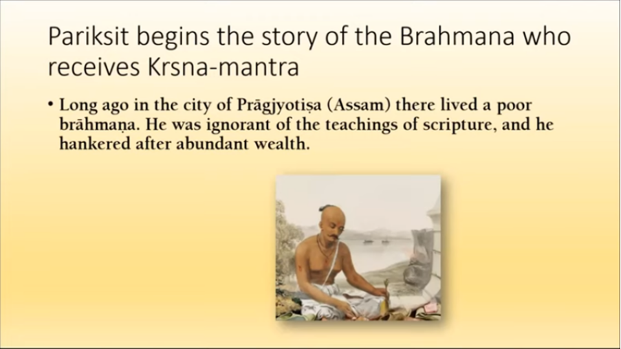 So, to answer this question, Parikshit begins to tell a story. So, this is another story within a story [Laughs]. So, it’s one of the brahmana when he meets Gopakumar and then Gopakumar begins to tell his story to this brahmana [Laughs] about what happened to him. So anyway, there was in Assam, Pragjyotisha, that’s in Assam, and Assam is kind of far northeast India, quite far from Bengal and there was a poor brahmana. So, he was a brahmana, but he was ignorant of the scriptures. And he wanted to get a lot of money [Laughs].
