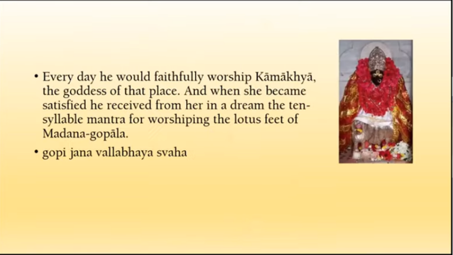 So he worshipped Kamakhya, that is a form of Durga in that place in Assam. So, she became very satisfied with his worship and she appeared to him in a dream. And she gave him a ten syllable Gopala, Madana Gopala mantra [Laughs]. So, the actual mantra is never described there [Laughs], the ten syllable mantra it says. But in the commentary of Sanatana Goswami there he quotes a little verse which explains the syllables of the mantra, but it is not normal language. It doesn’t say, it starts with go and then there’s p like that. They use rather strange words to describe each syllable, like a code. It’s like a secret code [Laughs]. And if you don’t know the code, you couldn’t figure out what the mantra was. So in other words, scriptures record mantras, but they also put them in some coded language. So unless you don’t know that language, you don’t know what the mantra is. You can’t figure out what it is [Laughs]. But the actual mantra is Gopijana Vallabhaya Svaha. If we figure out what those syllables mean in the description, it’s Gopijana Vallabhaya Svaha, ten syllable mantra.