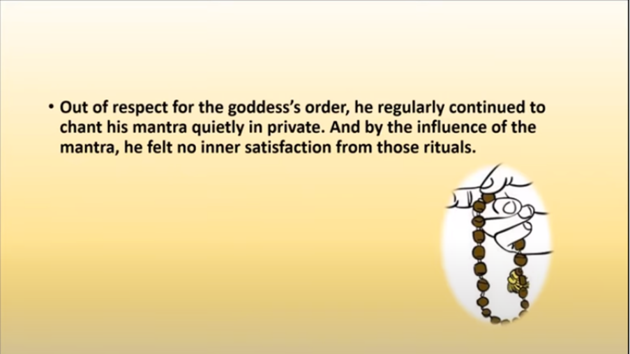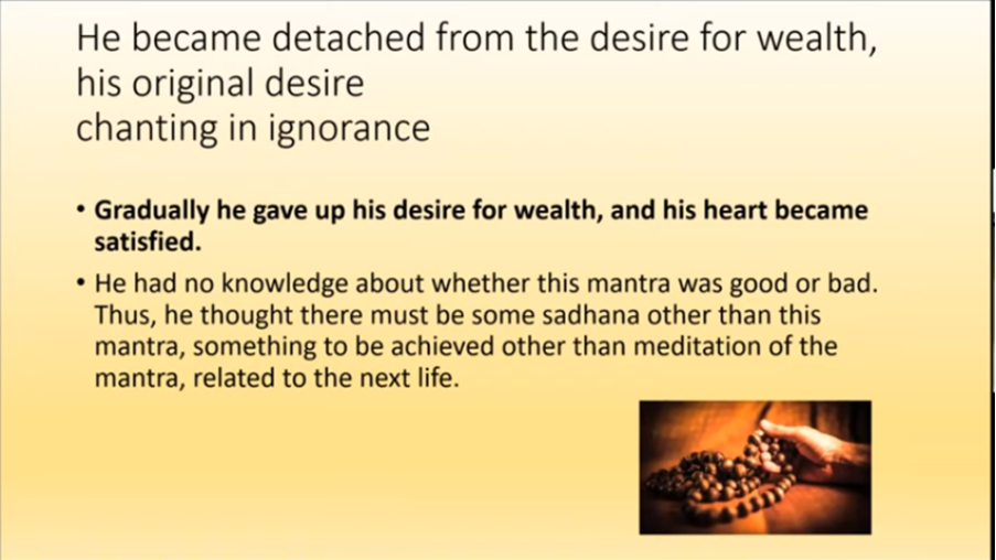 So, he began chanting that mantra according to the order of Durga Devi, but he didn’t know what the mantra was for. He didn’t know how to chant it properly. He didn’t know what the goal was, etc. This is like Namabhasa [Laughs]. He got some effect, but not the final effect. So he got purified and he lost his desire for wealth.So he had the mantra, but he said, may be there’s something better than this mantra. What do we achieve with this mantra? May be something better is there. You know like this, so, he didn’t quite know what to think of this mantra, but he chanted it anyway.