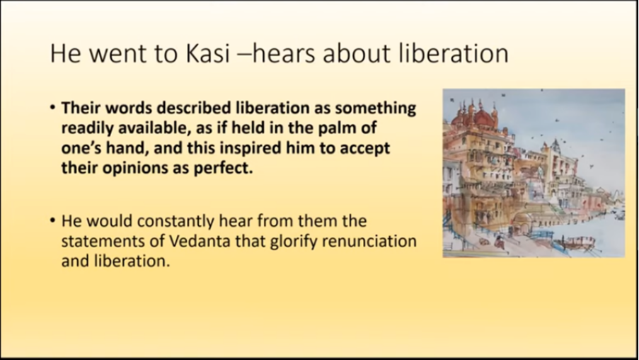 So, he left that place, and he went to Kasi, that is Varanasi. There, the brahmanas were speaking about liberation. And they said, it’s very easy to get liberation. So he listened, and he began to accept their opinion. So, he heard them glorify renunciation, giving up everything, and liberation.