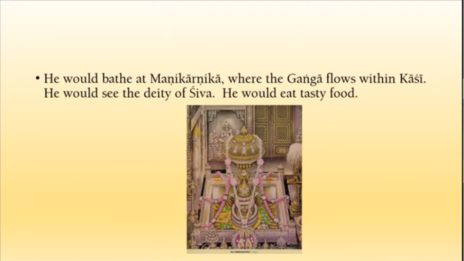 This was a famous bathing place there, Manikarnika, and he would bathe there everyday in the Ganga. And there’s also a very famous deity of Shiva there in Kasi, Vishweswara, Vishweswara Shiva. A very famous deity is there, in Kasi. So he would go see the deity, and then he would eat some tasty food [Laughs], and survive that way [Laughs].