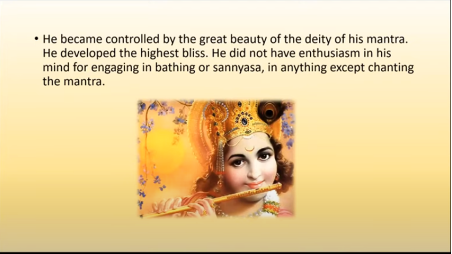But he continued to chant his mantra, his Madana Gopala mantra and he became very attracted to the deity that is Krishna deity and that mantra. Then he got the highest bliss from this. So then, he was not so enthusiastic about liberation, or bathing and sannyasa etc, and he just wanted to chant this mantra.