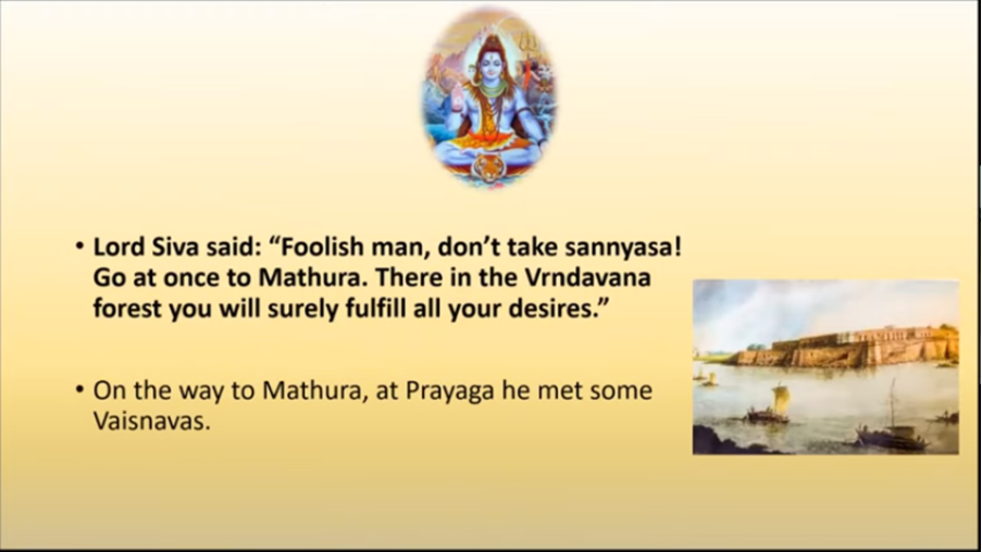 So, finally Shiva spoke to him. He said, you don’t take sannyasa, you go to Mathura [Laughs]. You go to the Vrindavan forest and there your desires will be fulfilled. So, he started going to Mathura, so he was in Varanasi, and he was going towards Mathura, but he came to Prayag or Allahabad on the way and then he met some Vaishnavas there.