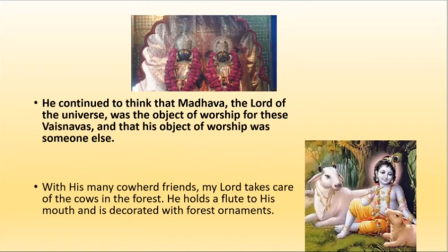 And those Vaishnavas were worshipping the deity of Madhava, that’s the Bindu Madhava deity. And he was attracted to that worship. But at the same time, then he thought, I have a deity mantra, and this deity of my mantra is different from that deity [Laughs]. It was different [Laughs]. It’s different. The deity there is different from the deity of my mantra.