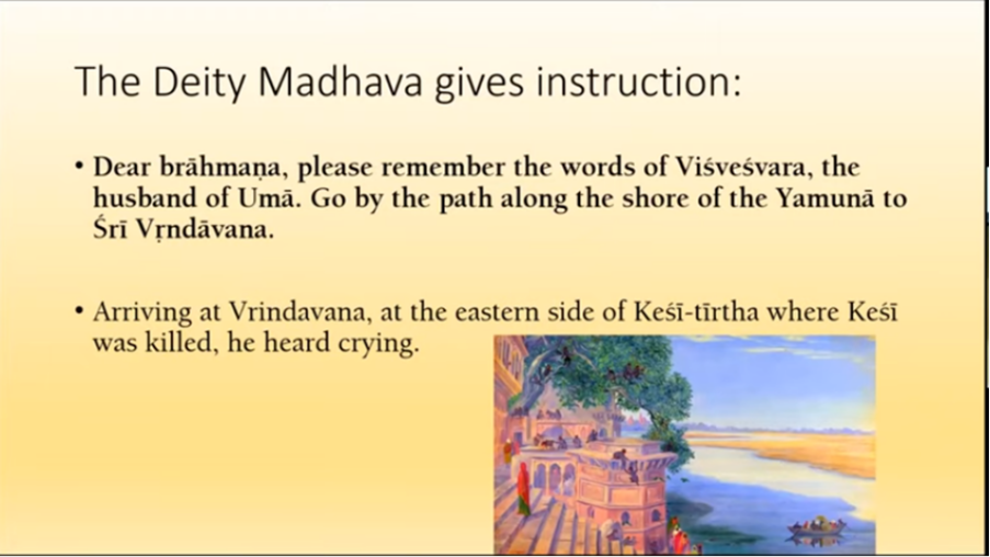 Yeah, Krishna is different from that deity. So then, the Madhava deity gave him some instruction. So He says, you remember the words of Shiva? He said, you go to Vrindavan, so you go there [Laughs], go on the Yamuna and go to Vrindavan. So, he continued on his way, and he got to Keshi tirtha. That’s where Keshi was killed. And there in the forest, he heard somebody crying out.
