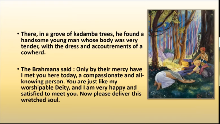 So, he searched around, and then in a Kadamba forest, he saw a young cowherd boy [Laughs], who’s dressed like a cowherd. So this is Gopakumar. He met Gopakumar. So, this is the Gopakumar. After Gopakumar had all of his experiences and had gone to the spiritual world, and gone everywhere [Laughs], he’d come back, and he was sitting there, and he was crying in ecstasy. This is when the brahmana met him.