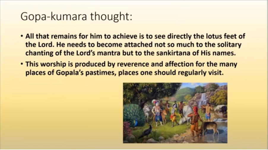 So then, Gopakumar was thinking how to educate this person [Laughs]. So then, he thought that actually he should directly see Krishna. But to do that, he should not just chant this mantra, but he should do Sankirtan, of Krishna’s name, Nama Sankirtan, and this is very powerful to get darshan of Krishna. And he should stay in the places where Krishna had His pastimes.