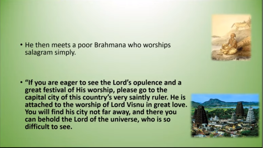 And as he was wandering on the bank of the Ganga, then he saw a poor brahmana who was worshipping a Salagrama, but he was worshipping very simply because he was very poor. So, he began praising the brahmana for his worship. But it was very simple worship. So the brahmana said, actually if you want to see real worship, you go to this city where there’s a king and he does very, very nice worship of Vishnu. So, you can see the Lord of the Universe there. The king is worshipping the Lord of the Universe. You go there and you’ll be very, very satisfied.
