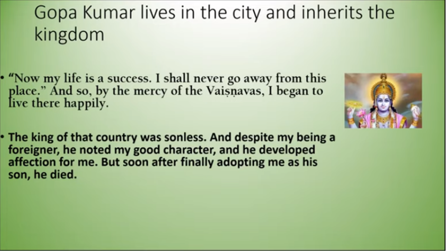 So Gopakumar went to that city, he saw everything, he saw the deity, he saw the nice worship and he was very happy. The king of the country had no son [Laughs]. So, the king became very attracted to this Gopakumar and his very good qualities, he treated him like a son [Laughs] and he adopted him as his son. And then the king died.
