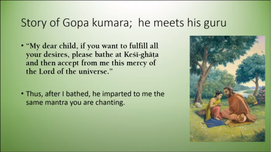 So then Gopakumar begins to tell his own story of how he realized Krishna, and he tells this story to the brahmana. So, Gopakumar was a cowherd in Vrindavan on earth. And one day he saw this saintly person there. So, this person told him to bathe in the Keshi ghat and then get the mercy of Krishna. So that Guru then gave him the same mantra that the brahmana was chanting, the Madana Gopala mantra. Later on, the Lord explains, actually I became the Guru [Laughs]. The Lord himself became the guru and gave the mantra [Laughs].