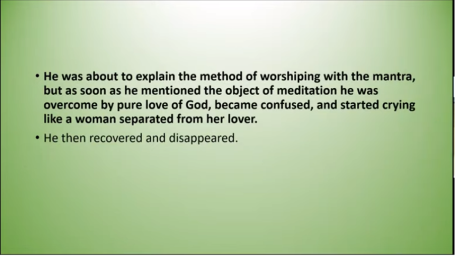 Okay, so when you get the mantra, the mantra of course is secret, it’s given secretly by the Guru to the disciple. And generally, traditionally, when they get these mantras, then they have to learn the method of chanting. So there’s a bija of the mantra, there’s a deity, [Not clear] deity of the mantra etc, you have to do nyasas with the mantra, place the syllables of the mantra on your body, and there’s karanyasa and anganyasa and things like this you have to do, before you start chanting the mantra. There’s many things you have to do, to purify yourself before you begin chanting. So anyway, he began to explain, but he was starting to explain who is the, you know, what this mantra means, you know about Krishna. And then when he started describing Krishna, he fainted [Laughs]. He cried and fainted and whatever [Laughs]. And then he disappeared.