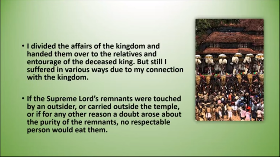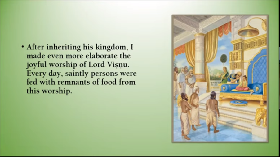 So, Gopakumar became the king [Laughs] of the kingdom [Laughs]. So, he, of course, did his duty and he was worshipping the Lord, he improved the worship of Vishnu even more. And then he would feed all of the saintly people with the prasad from the deity.