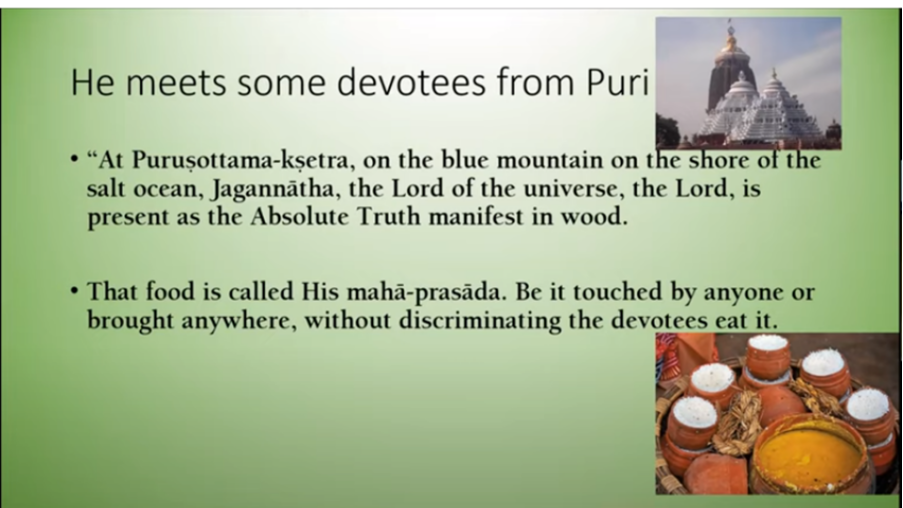 So then, he met some devotees from Puri and they began describing Jagannatha [Laughs]. So, they described this form made out of wood and they described the prasadam, even if it’s touched by anybody, impure or whatever, there’s no problem with that, people still eat it [Laughs].