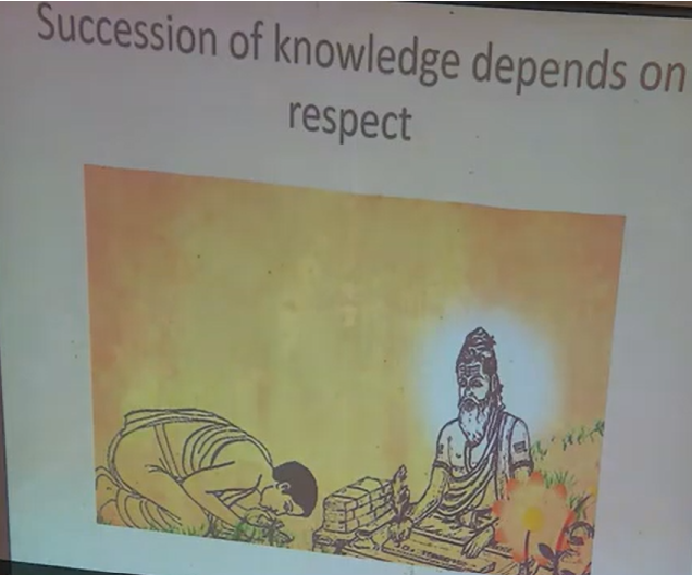 And as I said, the title of this presentation is ‘Respect’. So, to get knowledge, we have to respect properly. As we see in Bhagavad Gita in the fourth chapter, it talks about Pranipat. You get knowledge from the Guru, one who knows, by Pranipat, which means falling down [Laughs], completely and then asking pertinent questions and then serving. So, that’s the process, general process of getting knowledge. Not only spiritual knowledge, even material knowledge. We have to have this sort of submissiveness, surrender, respect, etc. for the person who’s hearing. And this is reflected in many quotations that we have when we talk about Gurus, etc.
