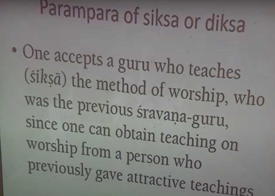And of course, this is carried over in the material world. So, if you have a music teacher traditionally, like a sitar teacher, then you have to treat him like God also. Of course, it’s material knowledge, but you treat him like God also. So, even in the material level, you give respect to your teacher. And of course, in the family also, we have the father. Father and mother are like God [Laughs]. And that’s carried over. Even the guest is like God, atithi seva, You treat the guest like God himself. So, it’s a common concept of respect. So, getting more particular, when we come to Gurus or teachers, then we have a parampara based on siksha, as we trace our parampara. Or you could do it on diksha.