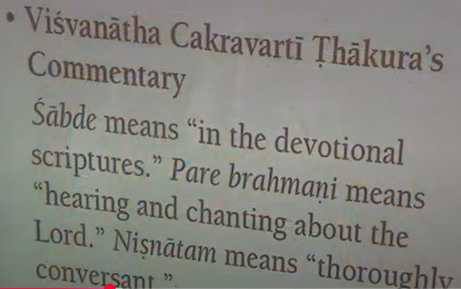 So, what is the qualification? Hearing and chanting about the Lord [Laughs]. ‘Pare brahmani’, This is Vishvanatha’s interpretation. Nisnatam means ‘thoroughly conversant with’. ‘Sabde’ means ‘devotional scriptures’.