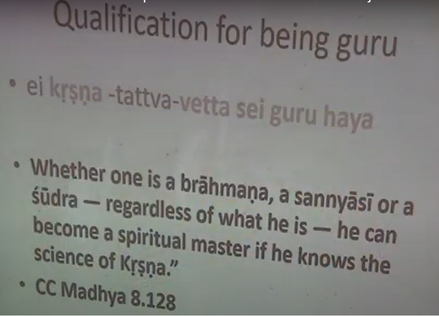 And then we can say, who can be a Guru? Anyone who is conversant with scripture, etc. We see this in 11th Canto again. Conversant with bhakti scriptures, etc. And fully tranquil. So, but then, what does fully conversant mean? And we have, of course, very general statements like this in Caitanya-caritamrta. Anyone who knows Krishna, he’s a Guru. He could be a brahmana, vaisya, sudra, kshatriya, sannyasi, grhastha, anybody. But he should know Krishna. But what does knowing Krishna mean [Laughs]? It’s a very general term [Laughs].