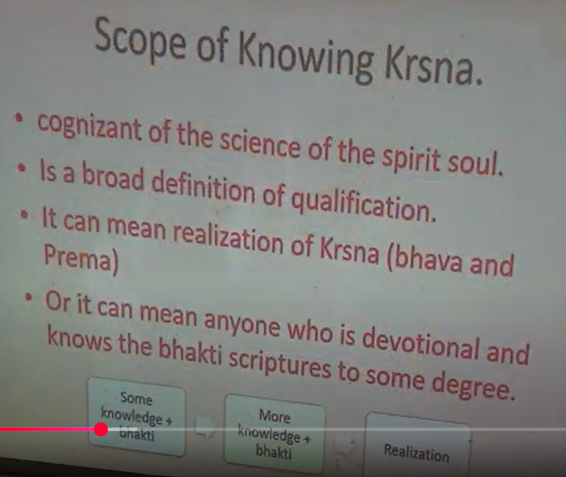 And of course, I think Prabhupada, in his explanation, says, to spread Krishna consciousness, one need only be cognizant of the science of the spirit soul. But again, that’s very general. What does that mean? How cognizant are we [Laughs], to become a Guru? So, we have, you know, a scope, a wide scope, when we say knowing Krishna, being Krishna conscious, etc. We have knowing a little bit, and maybe knowing the Bhagavad Gita. Then we have another level, knowing Bhagavad Gita and Bhagavatam, Nectar of Devotion, etc. Another level, then we maybe know other scriptures, maybe know the Sandarbhas. And then, of course, higher than that is realization. Who is realized? In other words, do you have Bhava or Prema? That could be another level of knowing Krishna. So we have a very general definition. It could include all of these. Obviously, then we would say, well, it’s better to have someone who is in Bhava or Prema, someone who has realized Krishna [Laughs]. But the definition is very broad, so we could include others as well.