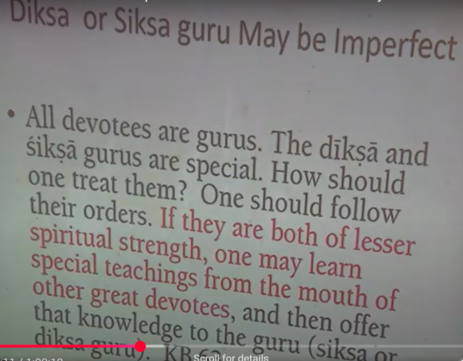 So, just to make it clear that the idea of Guru, whether Siksha or Diksha, can include not just the perfect stage of you know, Uttama adhikari or whatever, in Bhava or Prema. We have statements like in Krishna Bhajanamrita, that say that the Gurus may not be perfect, which means they are not on that stage of Bhava or Prema. So the Diksha and Siksha Gurus are special. How should one treat them? One should follow their orders. If they are both of lesser spiritual strength, which means they are not on the highest level, one may learn spiritual teaching from the mouth of other great devotees and then offer that knowledge to the Guru. So you give respect to your Guru, but you may find someone who is more advanced. So in other words, he is not at the highest level of Bhava or Prema or whatever.