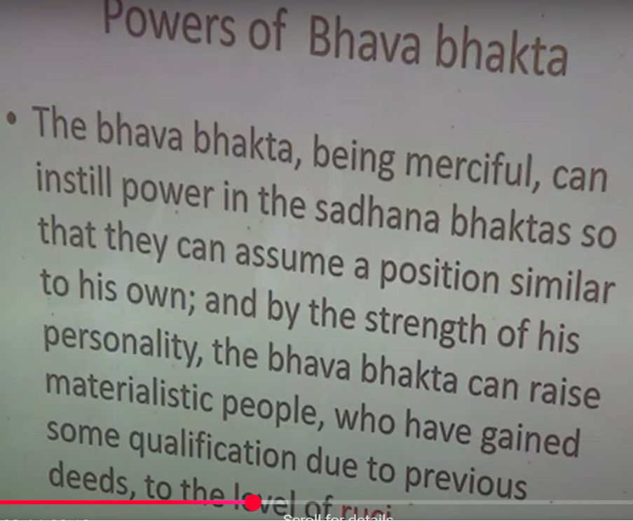 And then Bhaktivinoda Thakur talks about a person who has bhava. “The bhava-bhakta being merciful can instill power in the sadhana-bhaktas, so they can assume a position similar to his own. So if they’re already doing sadhana, then bhava-bhakta can bring them up to bhava stage. And by the strength of the personality, the bhava-bhakta can raise materialistic people who are not doing sadhana at all, to the level of Ruci at least, raise other people up as well.”