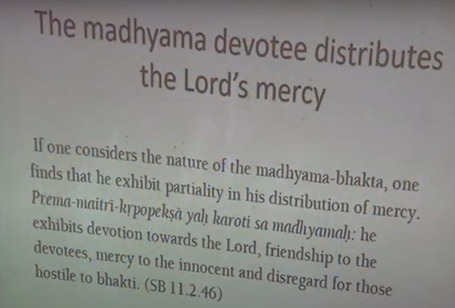 So, we see that I pointed out that the Madhyama devotees are the ones who are usually giving out the mercy in the material world. They could be on various levels. They could be on Anartha Nivrtti, they could be Nishtha, Ruci, or Asakti. So but according to their level of advancement, we’re going to give different levels of respect.