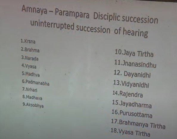 So, we have a whole series of whatever like this, up until the present time. We have all these different personalities. And of course, our Acharyas like Bhaktisiddhanta Saraswati Thakur and Srila Prabhupada could have chosen a Diksha Sampradaya to trace, because all of our previous Gurus had Gurus and they had Gurus by Diksha as well. But he didn’t do that. He traced a Siksha Sampradaya to emphasize the fact that the passing of knowledge is very important for us more than the passing of mantra through Diksha. So, I’ll get a little more into that later.