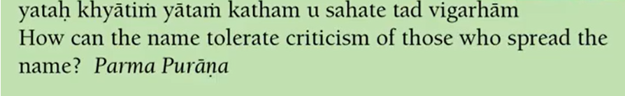 So, again the Padma Purana emphasizes the effect of these aparadhs. How can the name tolerate criticism of those who spread the name? So, this is sadhu ninda, criticizing the devotees who are spreading the glories of the holy name. So, this is the mad elephant offense. And this is the offense that can begin to destroy bhakti. And why? The devotees, as I said here, are the people who are spreading the holy name. So, not only they are spreading the holy name, they are spreading pure chanting of the name. They are spreading pure bhakti. And in this material world, there is no other source of pure bhakti or the pure name. And the supreme Lord, he empowers these people to distribute bhakti and the name. So, if we offend the devotees who are spreading the name and bhakti, then we are actually cutting off any hope of mercy. We may argue that okay, I will offend one devotee, but then I can go to another devotee and get his mercy [Laughs]. But this doesn’t work. Once you offend one devotee, Krishna withdraws mercy from all devotees [Laughs]. So, Krishna is empowering these devotees, you offend the devotees, then Krishna won’t give you any mercy. So, not only we can’t advance, actually we lose a taste for bhakti. And once we lose the taste for bhakti, then we don’t want to practice bhakti. But the only cure for the offense is to do bhakti and chant the name, and if you don’t want to do it, then you’re lost. So, that’s why it’s called the mad elephant offense.