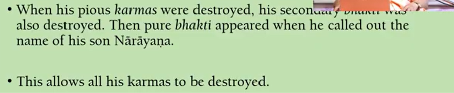 So Vishwanath Chakrawarthy explains that, yes he was practicing his karmas with a little bit of contaminated bhakti [Laughs], but he began to do sinful activities like drinking, etc. And this way, he destroyed all of his punyas. So not only his pious karmas or activity, even his secondary bhakti got destroyed [Laughs]. So in this way, he was left with nothing [Laughs]. No secondary bhakti, even if it was offensive, and no pious results of his karmas. And thus, when he chanted the name Narayana, there was no offense, there was no punya, and all of his karmas got destroyed.