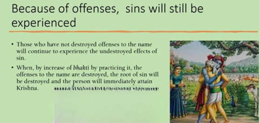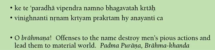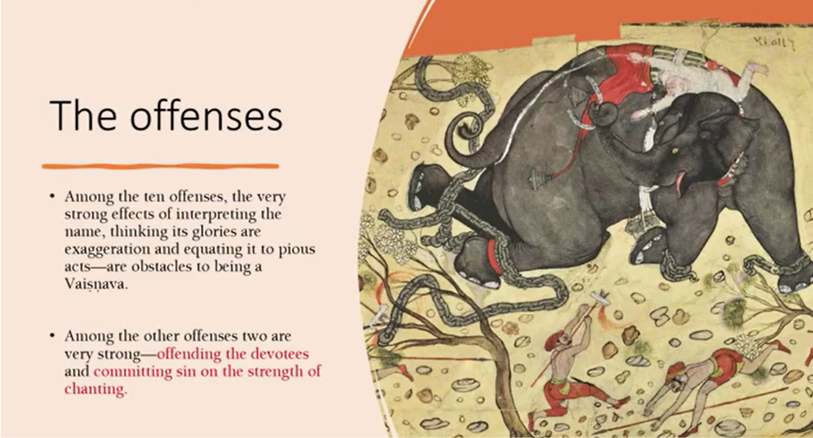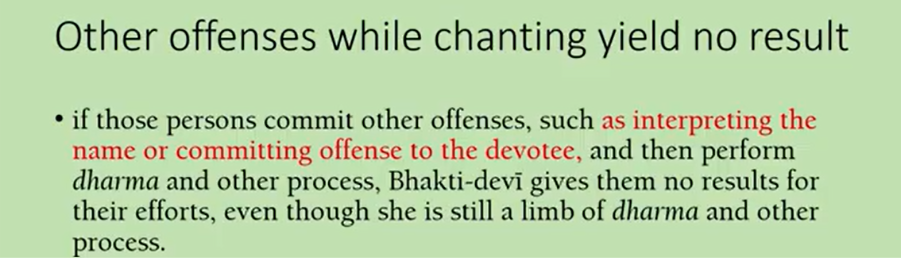 So, what are the offenses? So, interpreting the name, thinking its glories are exaggeration, equating with pious acts, these are offensive. So, these offenses will be very common among people who are doing impure bhakti or mixed bhakti. But then, as I said this before, the very strong offense ultimately is offending the devotees and then committing sin on the strength of the holy name. So, these last two actually give worse effect than the other ones.