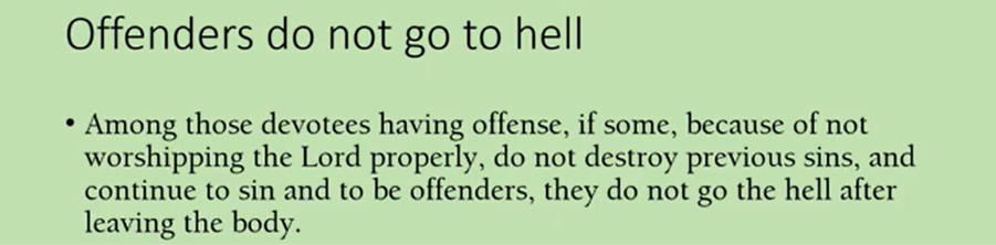 So the devotee who is practicing pure bhakti is in a special position. So he goes after many births but the devotee goes after leaving his body. So very quick process. So this is referring to a person who has no offenses. So even if the devotees have offenses, because they didn’t worship the Lord properly, they don’t destroy all of their sins and whatever. They still have some sin. They are still offenders. They don’t go to hell at least. That’s their blessing [Laughs].