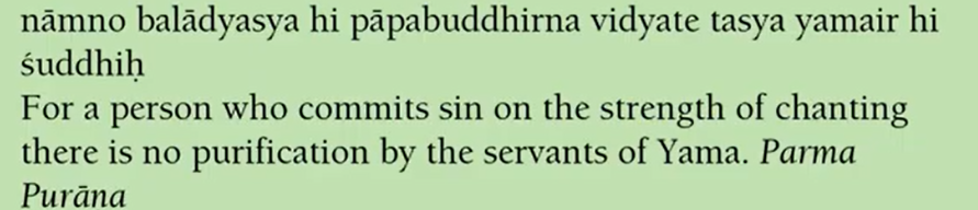 So, the second serious offense is committing sin on the strength of chanting. So, the name of course is all powerful and it destroys sin. But to utilize the name for that purpose and commit more sin, this becomes an exploitation of the mercy of the name. And instead of destroying your sins by doing that, you get worse effect [Laughs]. So, here it says you don’t get purification by the service of Yama, which means actually you’re going to get punished by Yama Raj. So, instead of getting purified of sin, you create more sin. But apart from not getting purified of sin and getting more sin, it also destroys your bhakti. So, these sins are very serious.