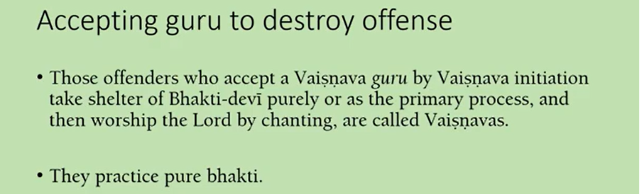 So how do we get rid of those offenses? You can take a Vaishnava Guru, take initiation. And if you do so, this means you’re taking shelter of pure bhakti. And you’re not using bhakti as a secondary means, it’s the primary means. So though bhakti and the name are the primary means, you could do karma yoga as a secondary process as long as there are no obstructions there. So it is karma mishra bhakti, but it is still pure bhakti.