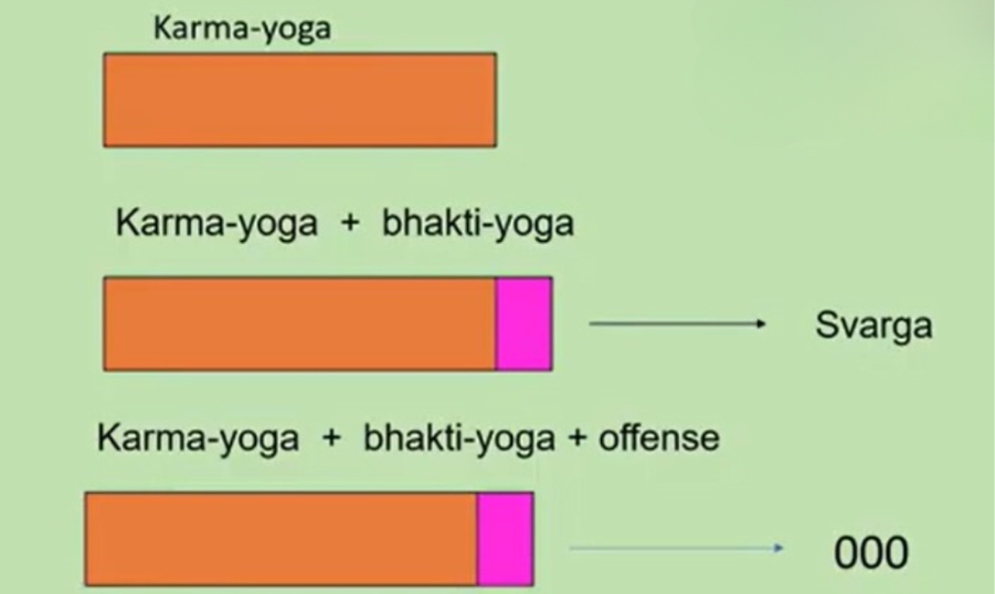 Still, bhakti yoga tolerates and gives them some result. But if you have worse offenses, more serious offense such as offending the devotees, then you get no effect [Laughs]. So even though you are doing the little bit of bhakti yoga with karma yoga, little bit of offenses there, if you have greater offense like offending devotees, then it’s zero again, back to zero [Laughs].