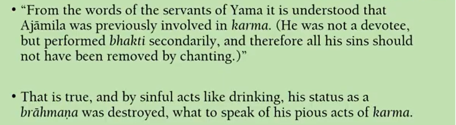 So the Yamadutas describe the history of Ajamil and in there, he was a brahmana who was practicing karmas. So he was not a devotee, he was doing karmas, but we assume that within that karma yoga, he was also worshipping Vishnu as a secondary element. And of course, this means that generally, with these people doing bhakti as a secondary element, they consider bhakti like a punya. So there is some slight offense there. And we said that he was chanting purely when he named his son Narayana. How can he be pure? Because he had actually been doing nama-aparada in his bhakti. So how is it possible?