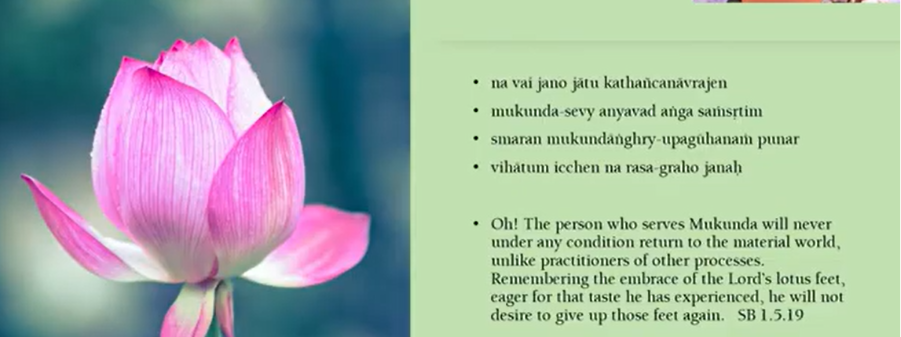 So this is one verse here again to illustrate that. “The person who serves Mukunda will never under any condition return to the material world unlike the practitioners of other processes. Remembering the embrace of the Lord’s lotus feet, eager for that taste he experienced, he will not desire to give up those feet again.”