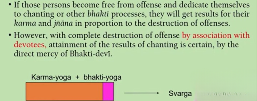 It’s better than no bhakti, but still there is some offense there. And even if he gets results of karma and jnana, his offense is not destroyed. So even if you attain svarga loka by doing karma yoga with a little bhakti, you may do animal sacrifices, still, you’re still subject to the effects of the animal sacrifice. So similarly, you do karma and jnana and you offend the holy name and the process, your offense remains after you get your results.