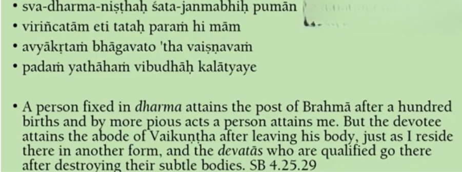 So here is a nice quotation. “A person fixed in dharma attains the post of Brahma after a hundred births and by more pious acts a person attains me. But the devotee attains the abode of Vaikuntha after leaving his body, just as I reside there in another form, and the devatas who are qualified go there destroying their subtle bodies.”