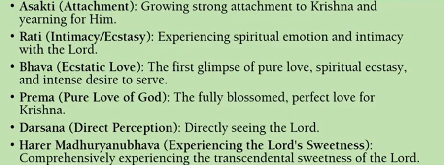 Then the anarthas get less and less, almost gone and the bhakti is very strong so this is called attachment or asakti in which the attachment is so strong you can almost see Krishna. And at this stage the practice of bhakti becomes so spontaneous that there is no effort at all in doing bhakti. And then we come to rati (bhava) which means we actually experience the Lord. This becomes deeper. We say it is bhava. It becomes deeper. It is called prema. So at prema no anarthas at all. So only bhakti fully manifested. And in that state you can have continuous perception of the Lord. So at bhava you get some temporary appearance of the Lord and prema permanent and that darshan is very wonderful. And then in prema you see the Lord and experience the Lord and all your senses become saturated with the sweetness of the Lord. So these are the stages one goes through if one has all these aparadhas or whatever gradual purification.