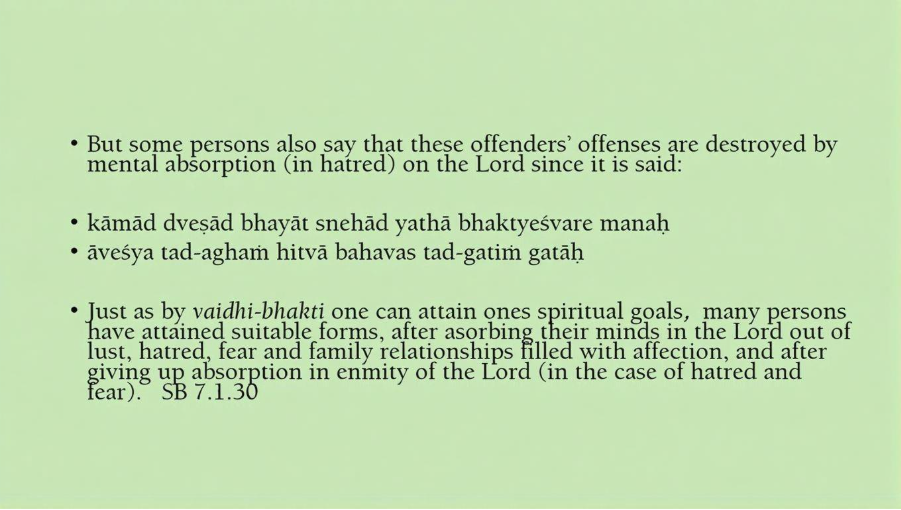And then there are people that say, with good reasoning, that even if people are offenders, they’re very bad offenders, even they hate the Lord, they can get purified. And so, we have statements in Bhagavatam like this – “Just as by Vaidhi Bhakti one can attain one’s spiritual goals, many persons have attained suitable forms after absorbing their minds in the Lord out of lust, hatred, fear and family relationships filled with affection and after giving up absorption and enmity of the Lord.” (SB 7.1.30)