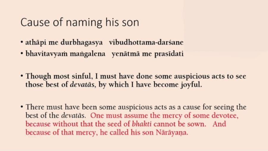 Later on, then there is an explanation, how he named his son Narayana. So, Vishwanath Chakravarti explains that there must have been some auspicious acts to cause him to name his son in that way. How did he get a chance to see the Vishnudutas? And then Vishwanath Chakravarti explains, it had to be mercy of devotee. So, without that mercy of devotees, we can’t get Bhakti. It’s because of that mercy, which he didn’t even know about, he named his son Narayana [Laughs]. So, even accidental Bhakti, by chanting Namabhas, as in Ajamil’s case, ultimately due to mercy of devotees.